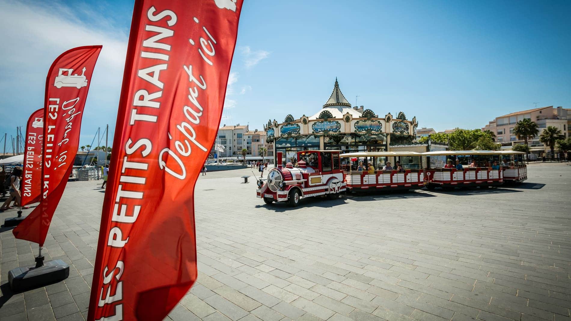 Les départs des petits trains se font sur l’Esplanade Pierre Racine, au Cap d’Agde. Un kiosque dédié à la vente des tickets vous y attend