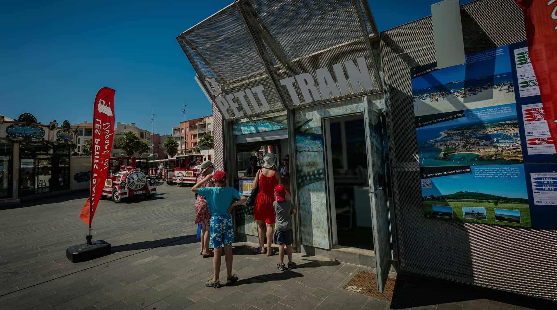 - Die kleinen Züge fahren von der Esplanade Pierre Racine in Cap d'Agde ab. Ein Kiosk für den Ticketverkauf erwartet Sie.